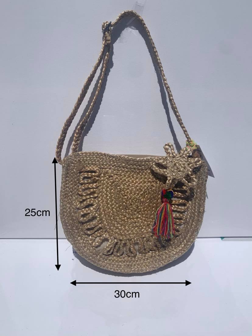 Sac en toile de jute avec fermeture éclair et bandoulière réglable. Doublure intérieure en tissu.